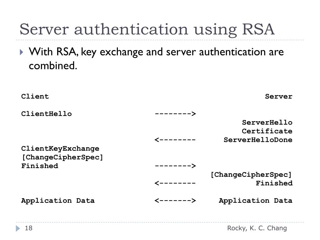 Server authentication using RSA • With RSA, key exchange and server authentication are combined.
