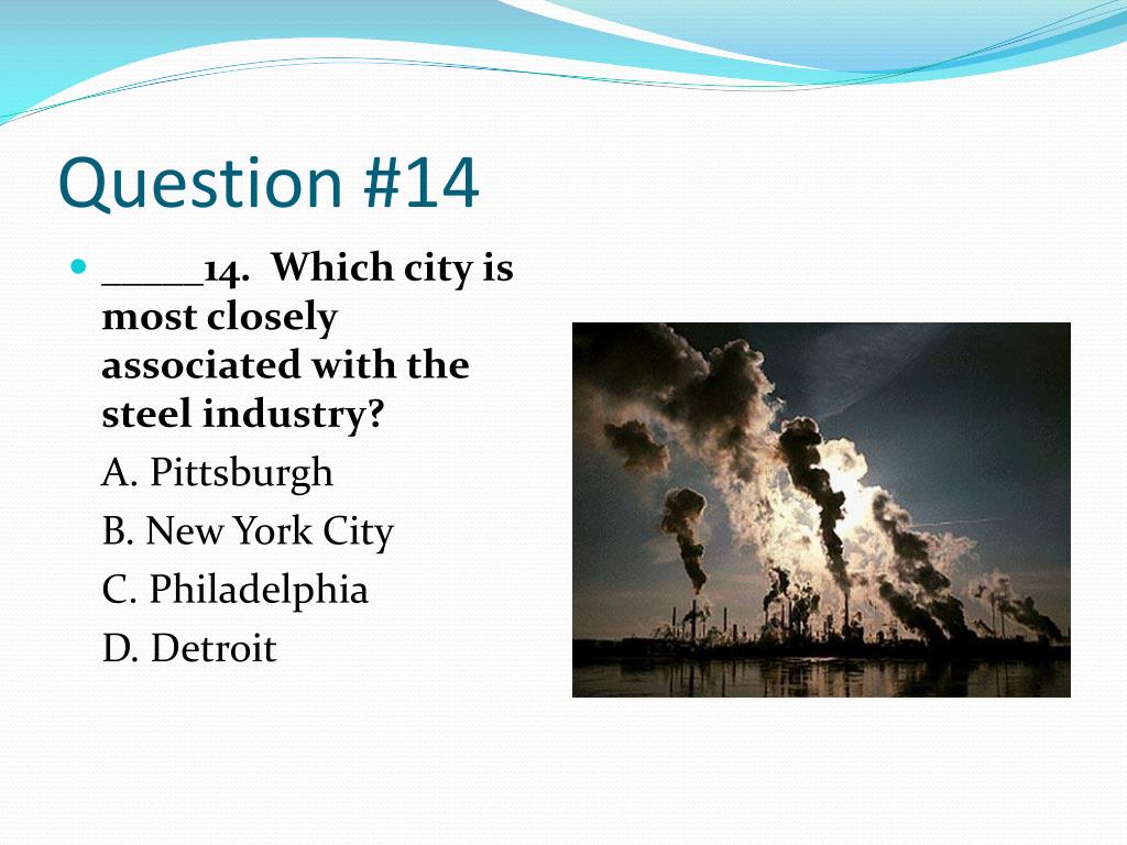 Question #14 • _____14. Which city is most closely associated with the steel industry? A. Pittsburgh B. New York City C. Philadelphia D. Detroit