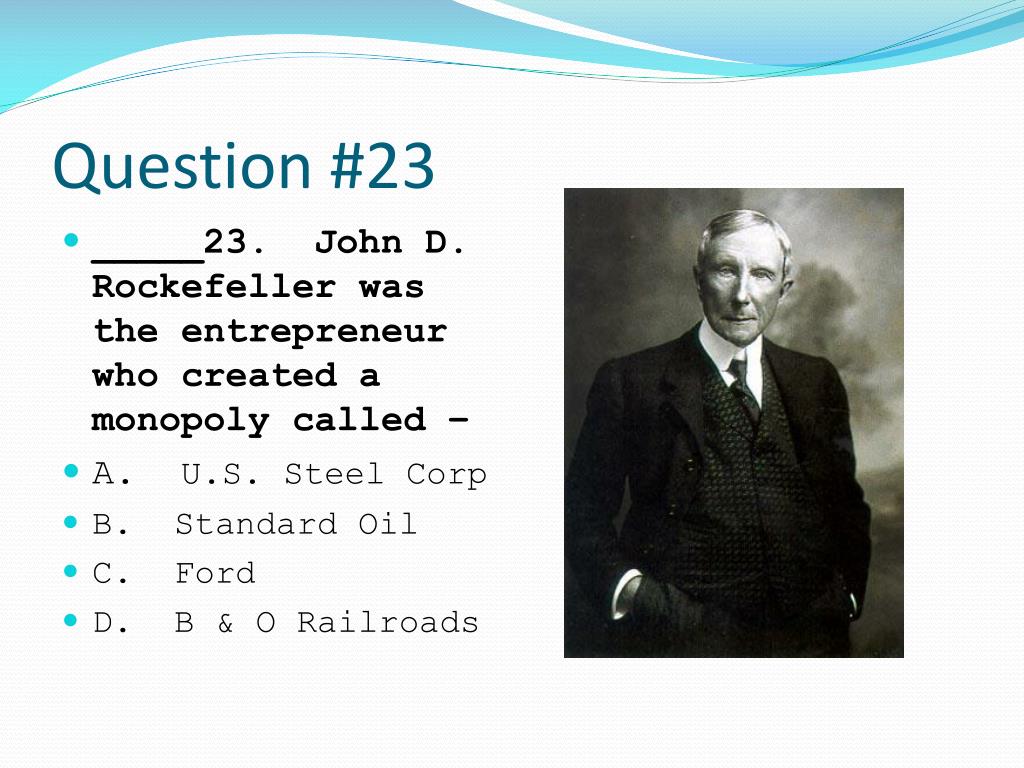 Question #23 • _____23. John D. Rockefeller was the entrepreneur who created a monopoly called – • A. U.S. Steel Corp • B. Standard Oil • C. Ford • D. B & O Railroads