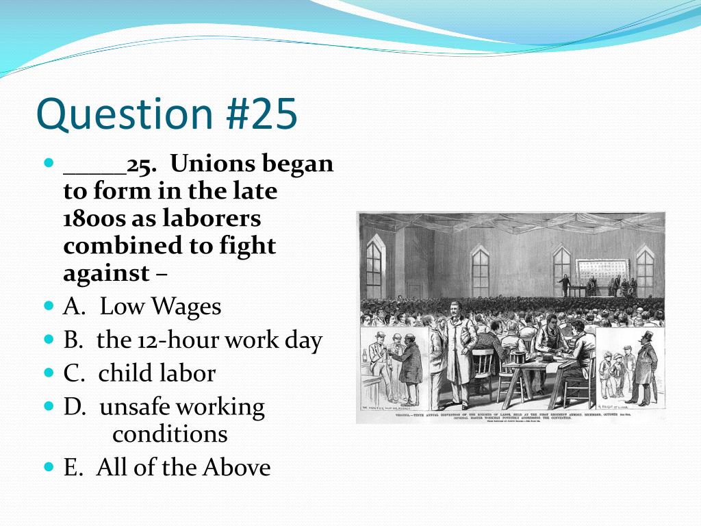 Question #25 • _____25. Unions began to form in the late 1800s as laborers combined to fight against – • A. Low Wages • B. the 12-hour work day • C. child labor • D. unsafe working conditions • E. All of the Above