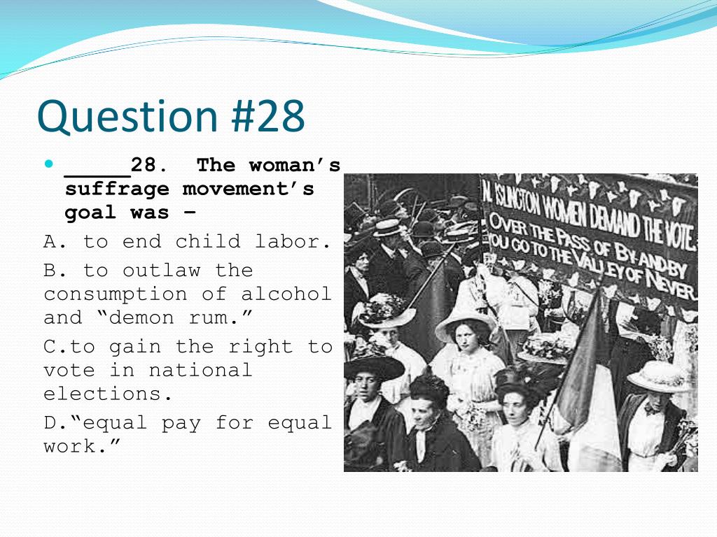 Question #28 • _____28. The woman’s suffrage movement’s goal was – A. to end child labor. B. to outlaw the consumption of alcohol and “demon rum.” C.to gain the right to vote in national elections. D.“equal pay for equal work.”