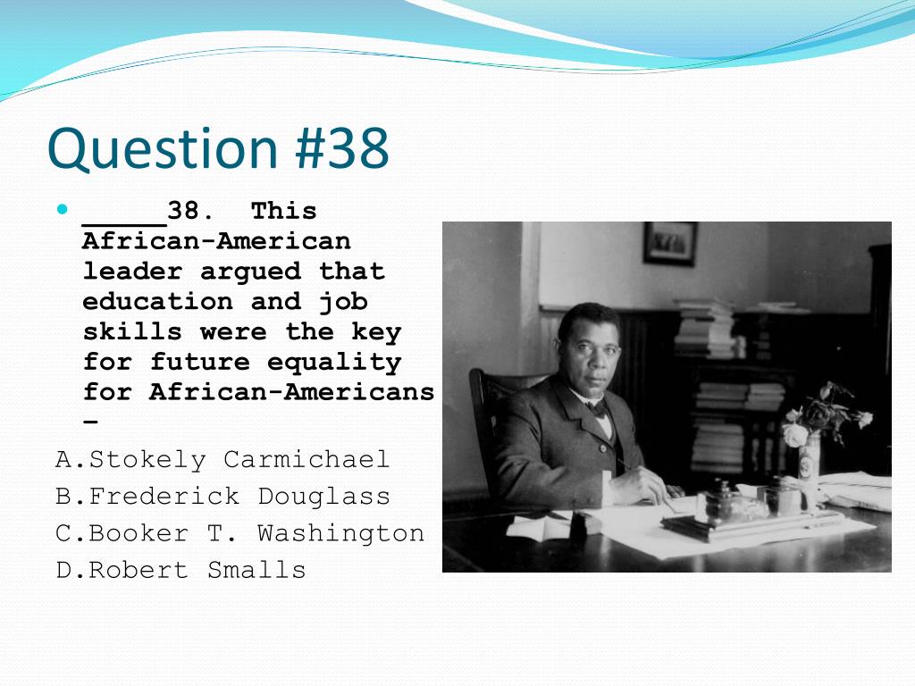 Question #38 • _____38. This African-American leader argued that education and job skills were the key for future equality for African-Americans – A.Stokely Carmichael B.Frederick Douglass C.Booker T. Washington D.Robert Smalls