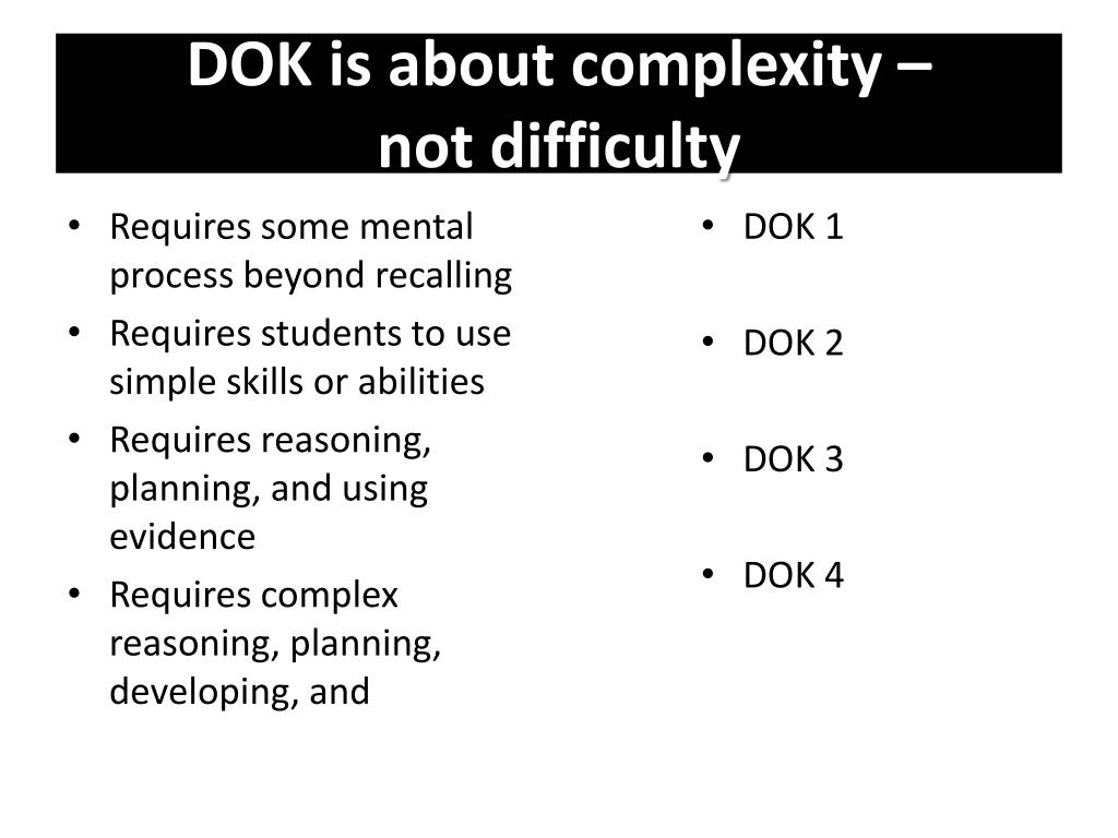DOK is about complexity – not difficulty • Requires some mental process beyond recalling • Requires students to use simple skills or abilities • Requires reasoning, planning, and using evidence • Requires complex reasoning, planning, developing, and • DOK 1 • DOK 2 • DOK 3 • DOK 4