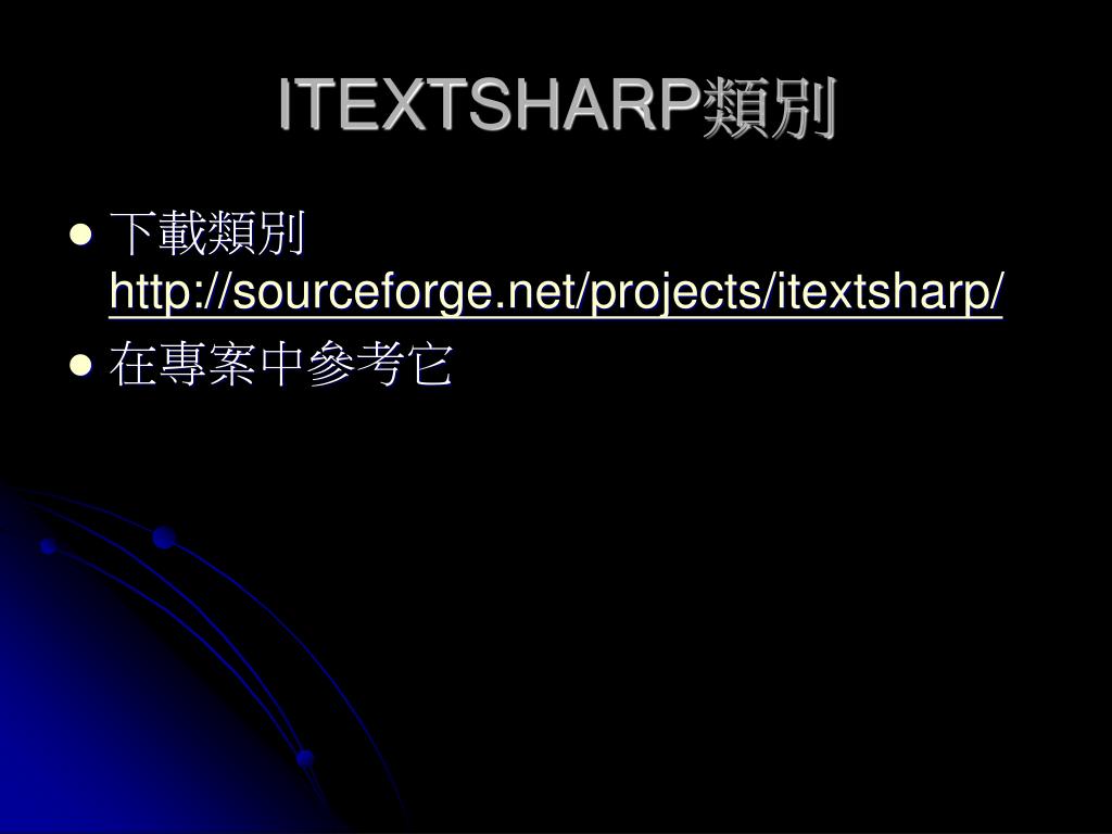ITEXTSHARP類別 • 下載類別http://sourceforge.net/projects/itextsharp/ • 在專案中參考它
