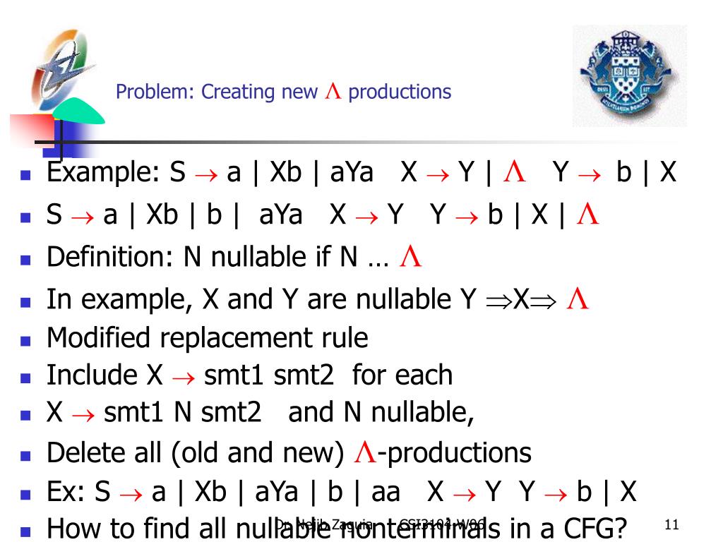 Problem: Creating new Λ productions • Example: S a | Xb | aYa X Y | Λ Y b | X • S a | Xb | b | aYa X Y Y b | X | Λ • Definition: N nullable if N … Λ • In example, X and Y are nullable Y XΛ • Modified replacement rule • Include X smt1 smt2 for each • X smt1 N smt2 and N nullable, • Delete all (old and new) Λ-productions • Ex: S a | Xb | aYa | b | aa X Y Y b | X • How to find all nullable nonterminals in a CFG? Dr. Nejib Zaguia CSI3104-W06