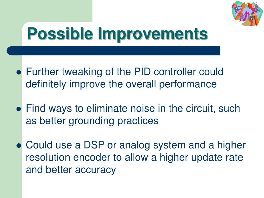 Further tweaking of the PID controller could definitely improve the overall performance Find ways to eliminate noise in the circuit, such as better grounding practices Could use a DSP or analog system and a higher resolution encoder to allow a higher update rate and better accuracy Possible Improvements