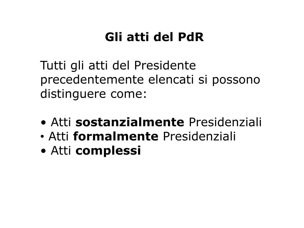 Atti formalmente presidenziali Atti che solo nella forma sono del Presidente mentre il contenuto, la sostanza, è predisposto e voluto dai membri del Governo. Es. i decreti legge, i decreti legislativi, i regolamenti governativi