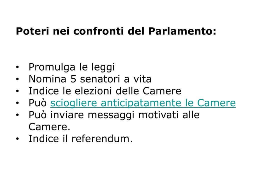 Poteri nei confronti del Parlamento: • Promulga le leggi • Nomina 5 senatori a vita • Indice le elezioni delle Camere • Può sciogliere anticipatamente le Camere • Può inviare messaggi motivati alle Camere. • Indice il referendum.