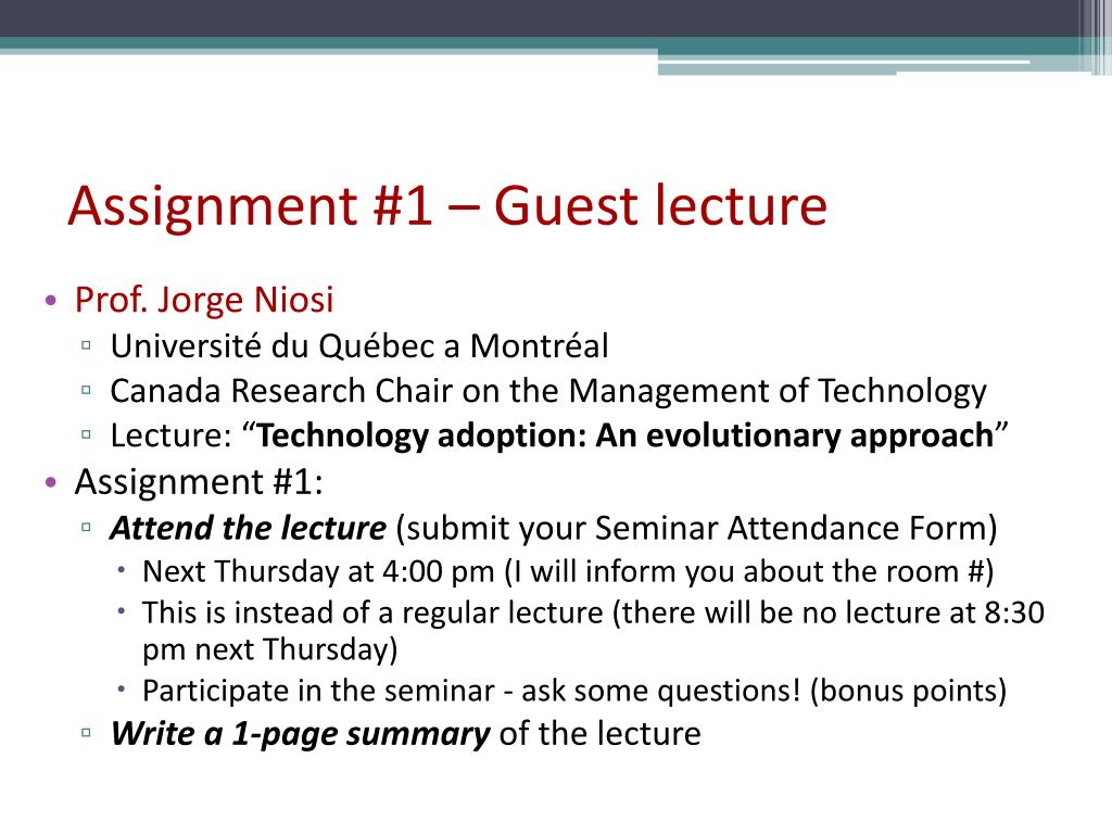Assignment #1 – Guest lecture • Prof. Jorge Niosi • Université du Québec a Montréal • Canada Research Chair on the Management of Technology • Lecture: “Technology adoption: An evolutionary approach” • Assignment #1: • Attend the lecture (submit your Seminar Attendance Form) • Next Thursday at 4:00 pm (I will inform you about the room #) • This is instead of a regular lecture (there will be no lecture at 8:30 pm next Thursday) • Participate in the seminar - ask some questions! (bonus points) • Write a 1-page summary of the lecture