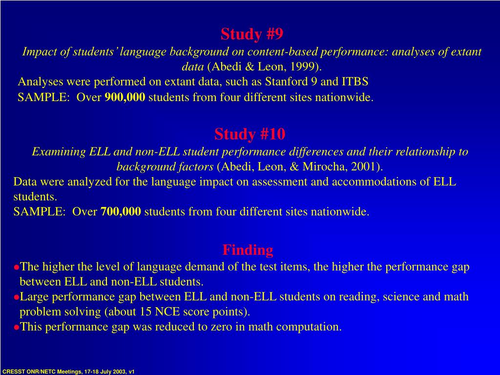 Study #9 Impact of students’ language background on content-based performance: analyses of extant data (Abedi & Leon, 1999). Analyses were performed on extant data, such as Stanford 9 and ITBS SAMPLE: Over 900,000 students from four different sites nationwide. Study #10 Examining ELL and non-ELL student performance differences and their relationship to background factors (Abedi, Leon, & Mirocha, 2001). Data were analyzed for the language impact on assessment and accommodations of ELL students. SAMPLE: Over 700,000 students from four different sites nationwide. Finding • The higher the level of language demand of the test items, the higher the performance gap between ELL and non-ELL students. • Large performance gap between ELL and non-ELL students on reading, science and math problem solving (about 15 NCE score points). • This performance gap was reduced to zero in math computation.
