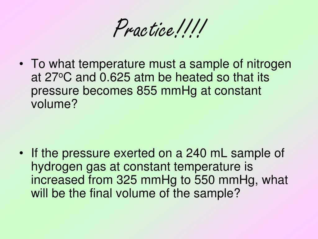 Practice!!!! • To what temperature must a sample of nitrogen at 27oC and 0.625 atm be heated so that its pressure becomes 855 mmHg at constant volume? • If the pressure exerted on a 240 mL sample of hydrogen gas at constant temperature is increased from 325 mmHg to 550 mmHg, what will be the final volume of the sample?
