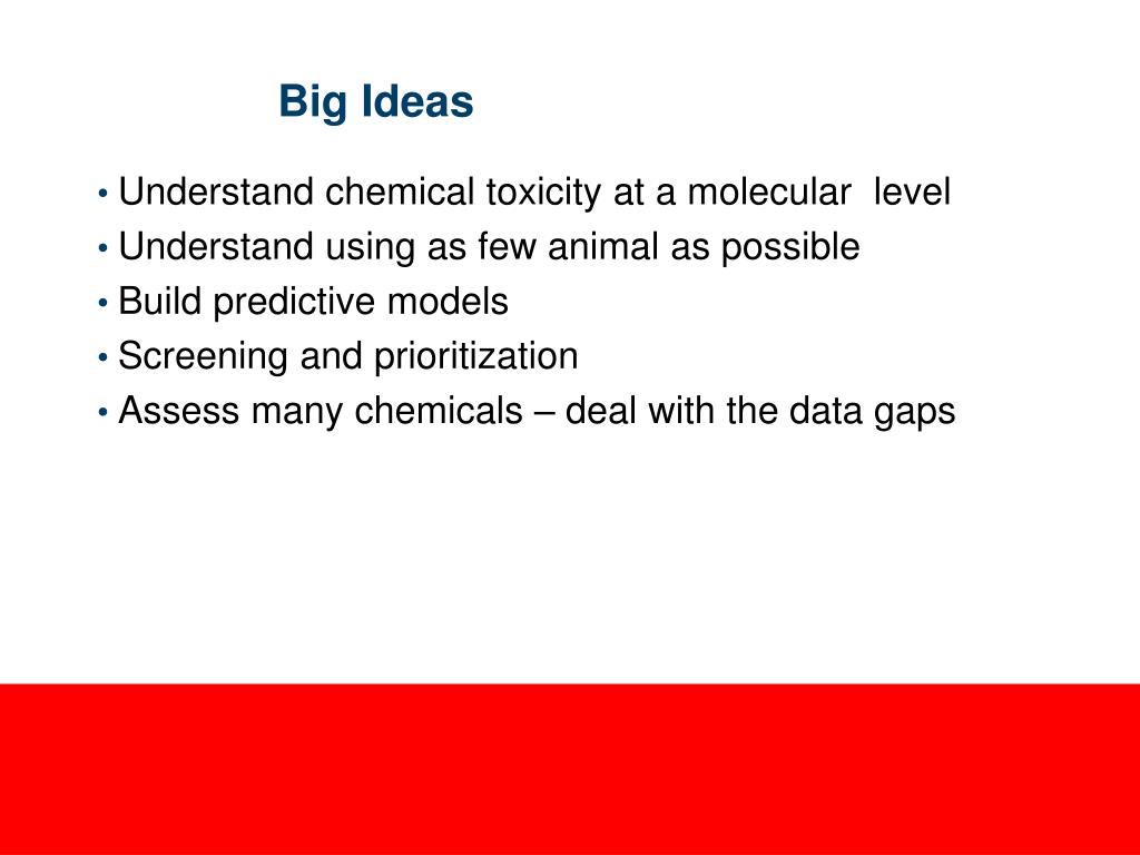 Big Ideas • Understand chemical toxicity at a molecular level • Understand using as few animal as possible • Build predictive models • Screening and prioritization • Assess many chemicals – deal with the data gaps