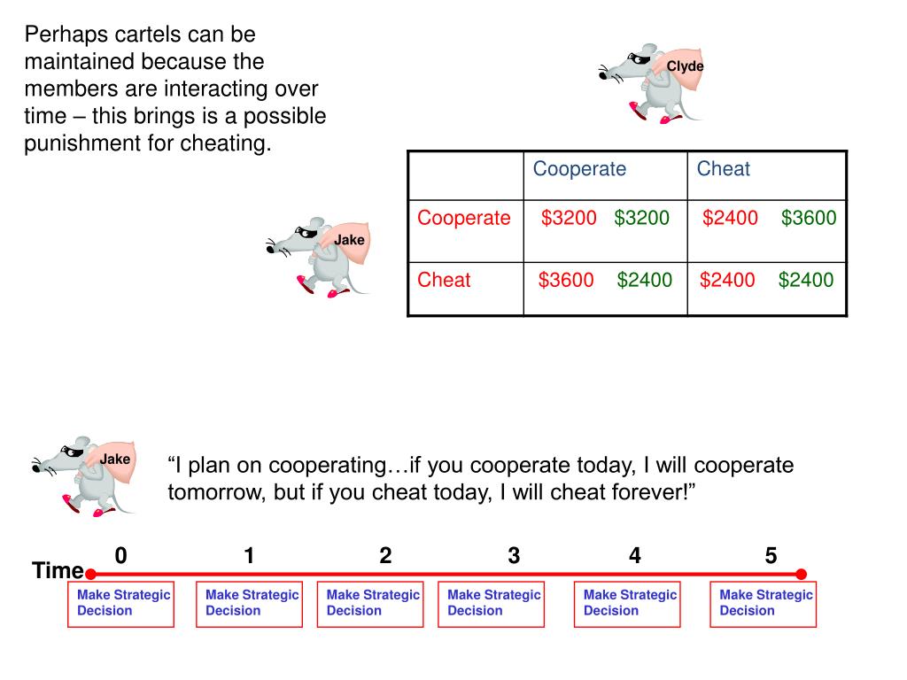 Perhaps cartels can be maintained because the members are interacting over time – this brings is a possible punishment for cheating. Clyde Jake Jake “I plan on cooperating…if you cooperate today, I will cooperate tomorrow, but if you cheat today, I will cheat forever!” 0 1 2 3 4 5 Time Make Strategic Decision Make Strategic Decision Make Strategic Decision Make Strategic Decision Make Strategic Decision Make Strategic Decision