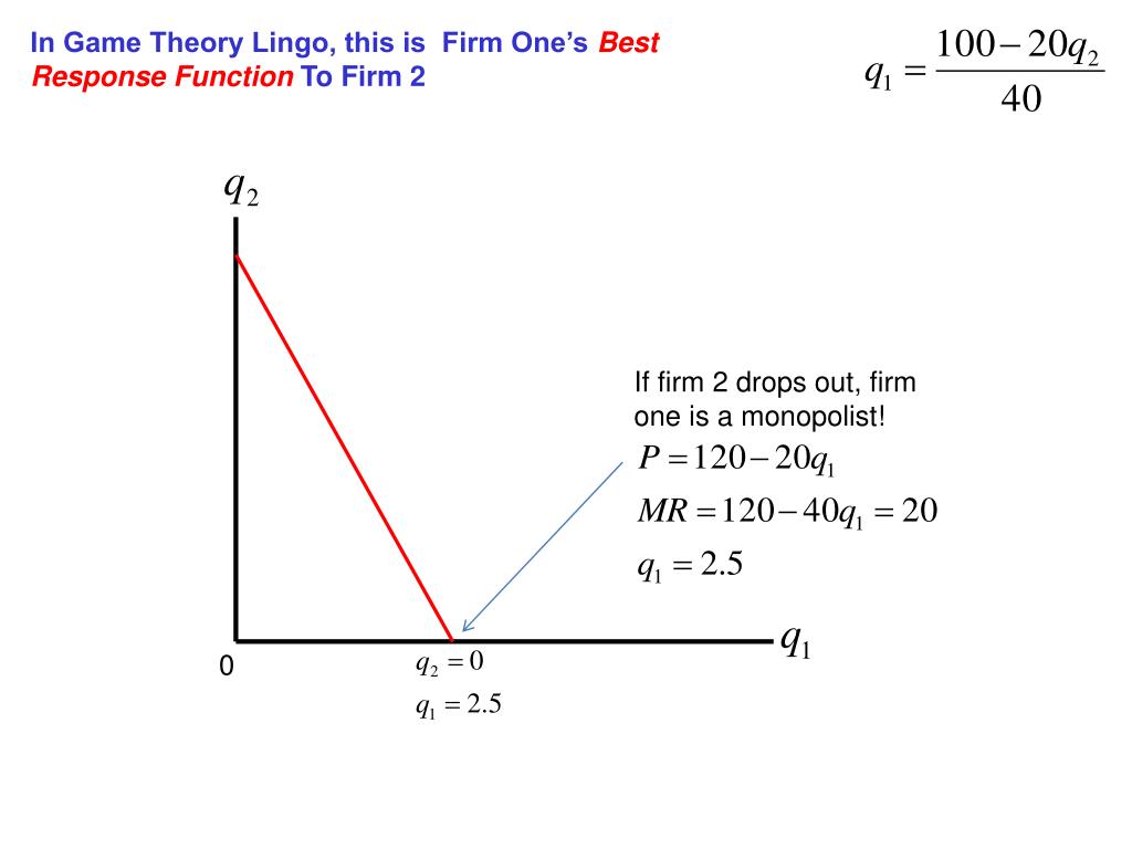 In Game Theory Lingo, this is Firm One’s Best Response Function To Firm 2 If firm 2 drops out, firm one is a monopolist! 0
