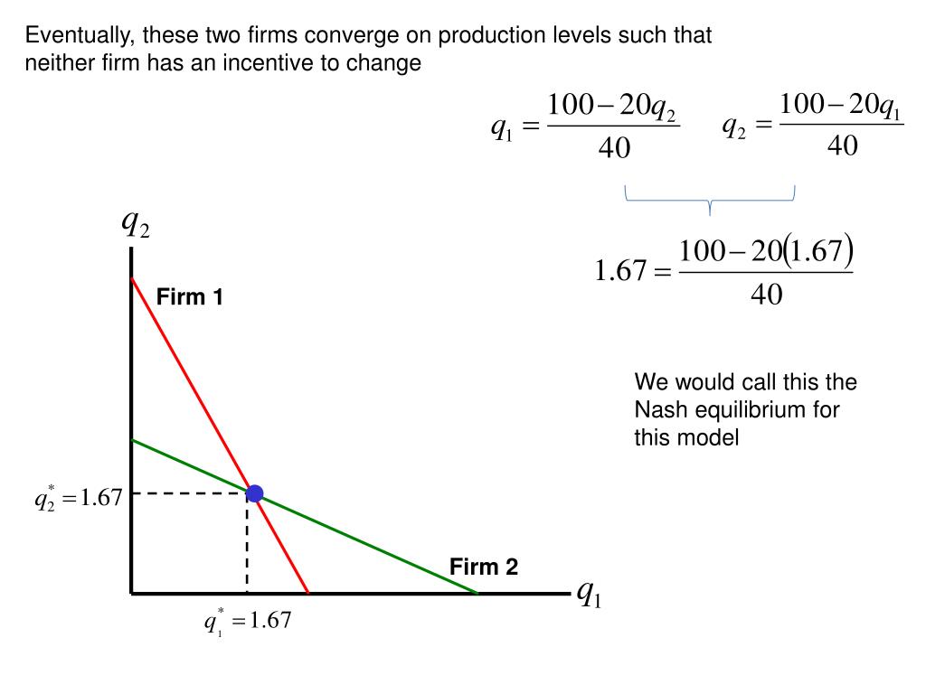 Eventually, these two firms converge on production levels such that neither firm has an incentive to change Firm 1 We would call this the Nash equilibrium for this model Firm 2
