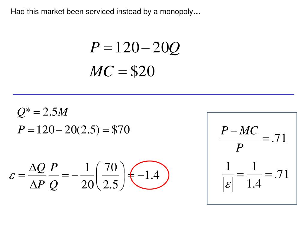 Recall, we had an aggregate demand and a constant marginal cost of production. CS = (.5)(120 – 70)(2.5) = $62.5 Monopoly $120 $62.5 $70 D What would it be worth to consumers to add another firm to the industry? 2.5