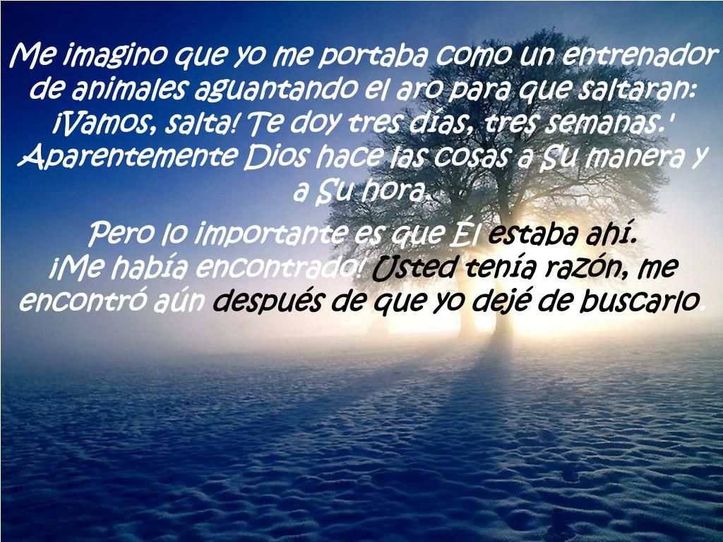Me imagino que yo me portaba como un entrenador de animales aguantando el aro para que saltaran: ¡Vamos, salta! Te doy tres días, tres semanas.' Aparentemente Dios hace las cosas a Su manera y a Su hora. Pero lo importante es que Él estaba ahí.¡Me había encontrado! Usted tenía razón, me encontró aún después de que yo dejé de buscarlo.