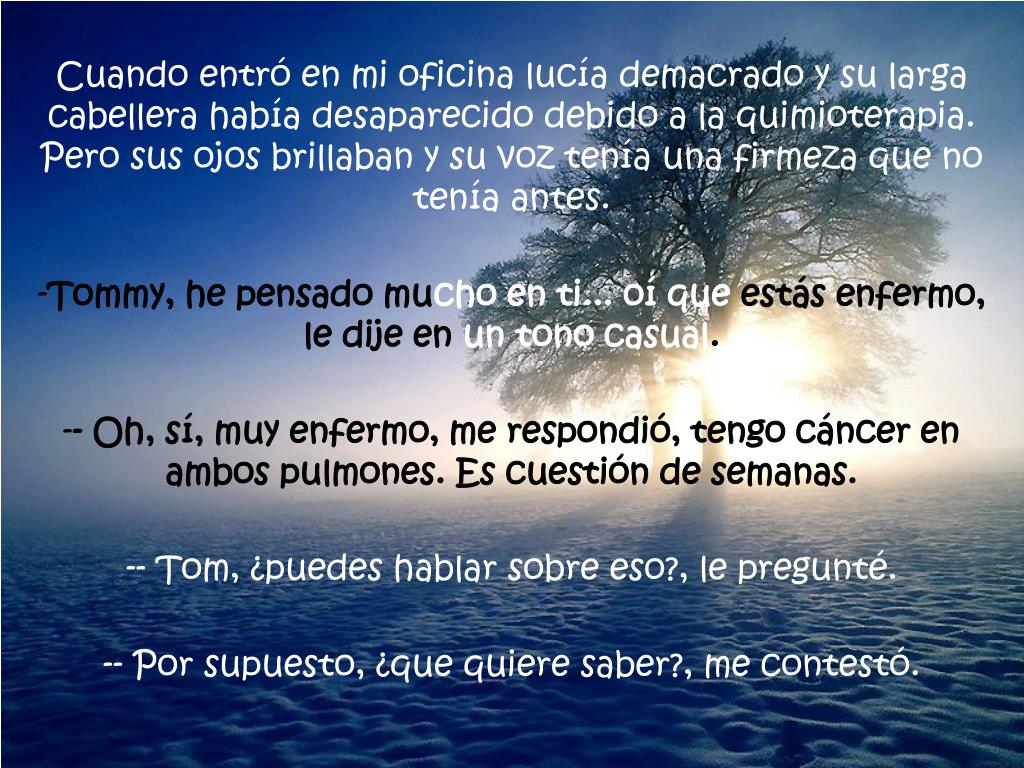 Cuando entró en mi oficina lucía demacrado y su larga cabellera había desaparecido debido a la quimioterapia. Pero sus ojos brillaban y su voz tenía una firmeza que no tenía antes. • Tommy, he pensado muchoen ti... oí que estás enfermo, le dije en un tono casual. • - Oh, sí, muy enfermo, me respondió, tengo cáncer en ambos pulmones. Es cuestión de semanas. • - Tom, ¿puedes hablar sobre eso?, le pregunté. • - Por supuesto, ¿que quiere saber?, me contestó.
