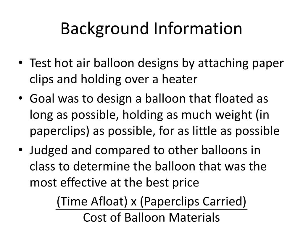 Background Information • Test hot air balloon designs by attaching paper clips and holding over a heater • Goal was to design a balloon that floated as long as possible, holding as much weight (in paperclips) as possible, for as little as possible • Judged and compared to other balloons in class to determine the balloon that was the most effective at the best price (Time Afloat) x (Paperclips Carried)Cost of Balloon Materials