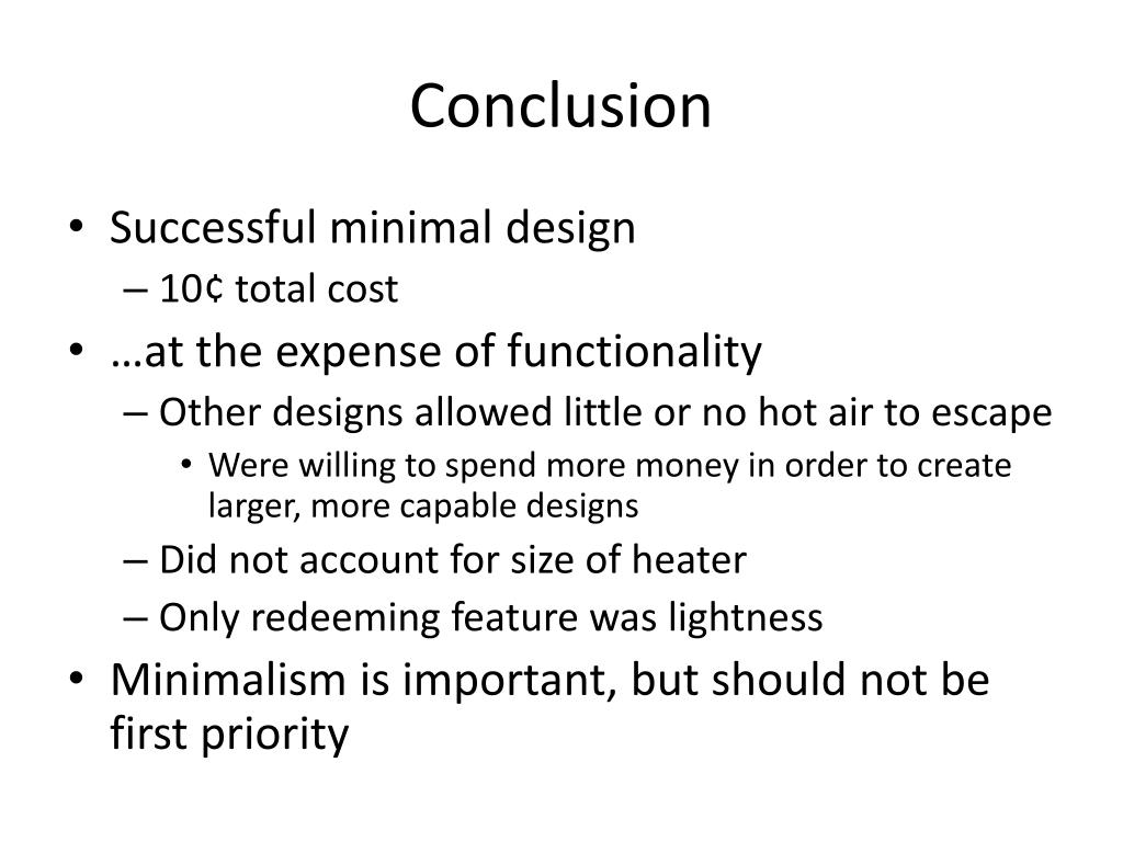 Conclusion • Successful minimal design • 10¢ total cost • …at the expense of functionality • Other designs allowed little or no hot air to escape • Were willing to spend more money in order to create larger, more capable designs • Did not account for size of heater • Only redeeming feature was lightness • Minimalism is important, but should not be first priority