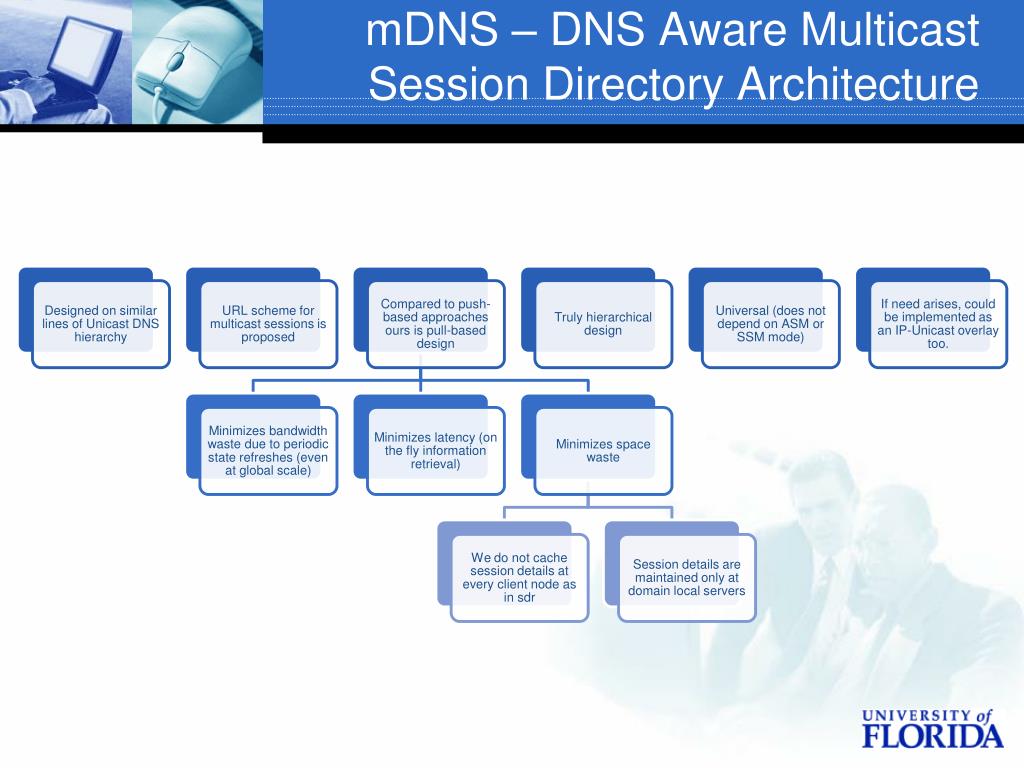 mDNS URL Design • In mDNS, sessions can be accessed directly if creator successfully registers keyword with it’s domain’s URS server. • mDNS URL syntax • <protocol>://<domain URL>/<URS Keyword> • Protocol could be http or any valid protocol type • Domain URL helps resolve MSD server located in the creator domain, it begins with mcast. • Example mDNS URL could be • http://mcast.cise.ufl.edu/gators • This would refer to multicast session hosted under cise domain with keyword ‘gators’ registered with cise URS server. • What is returned is the session’s details. mDNS capable browser could then launch an appropriate plug-in to display the multicast contents sent on that channel.