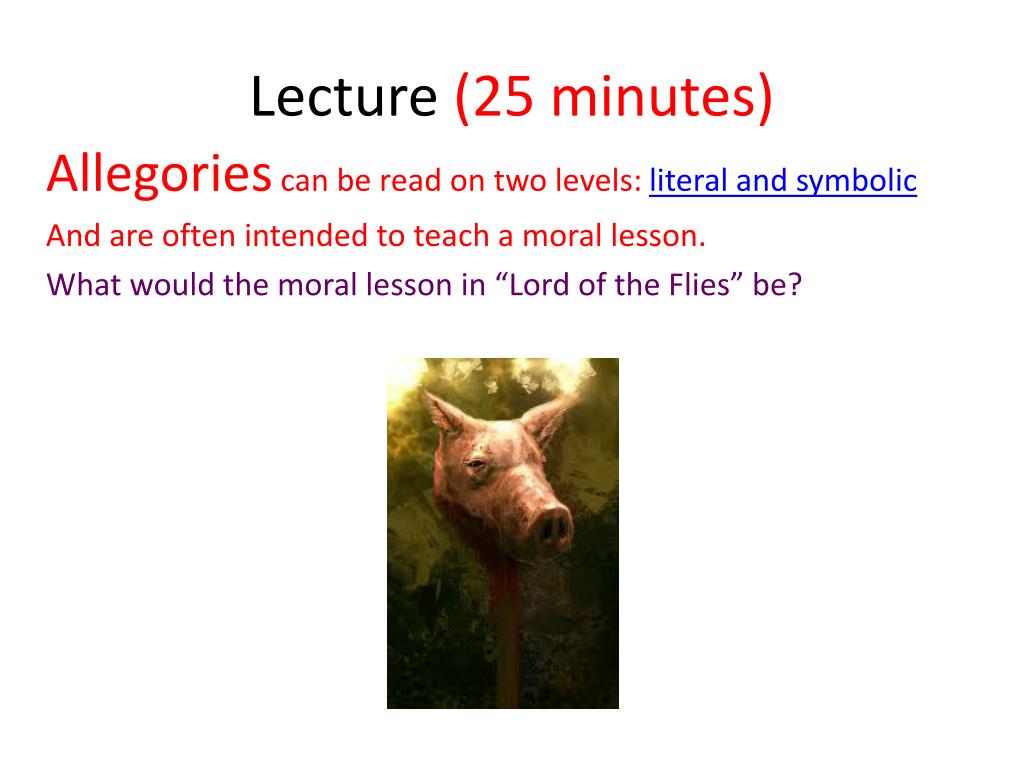 Lecture (25 minutes) Allegories can be read on two levels: literal and symbolic And are often intended to teach a moral lesson. What would the moral lesson in “Lord of the Flies” be?