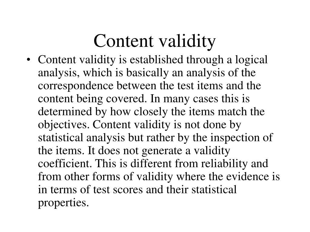 Content validity • Content validity is established through a logical analysis, which is basically an analysis of the correspondence between the test items and the content being covered. In many cases this is determined by how closely the items match the objectives. Content validity is not done by statistical analysis but rather by the inspection of the items. It does not generate a validity coefficient. This is different from reliability and from other forms of validity where the evidence is in terms of test scores and their statistical properties.