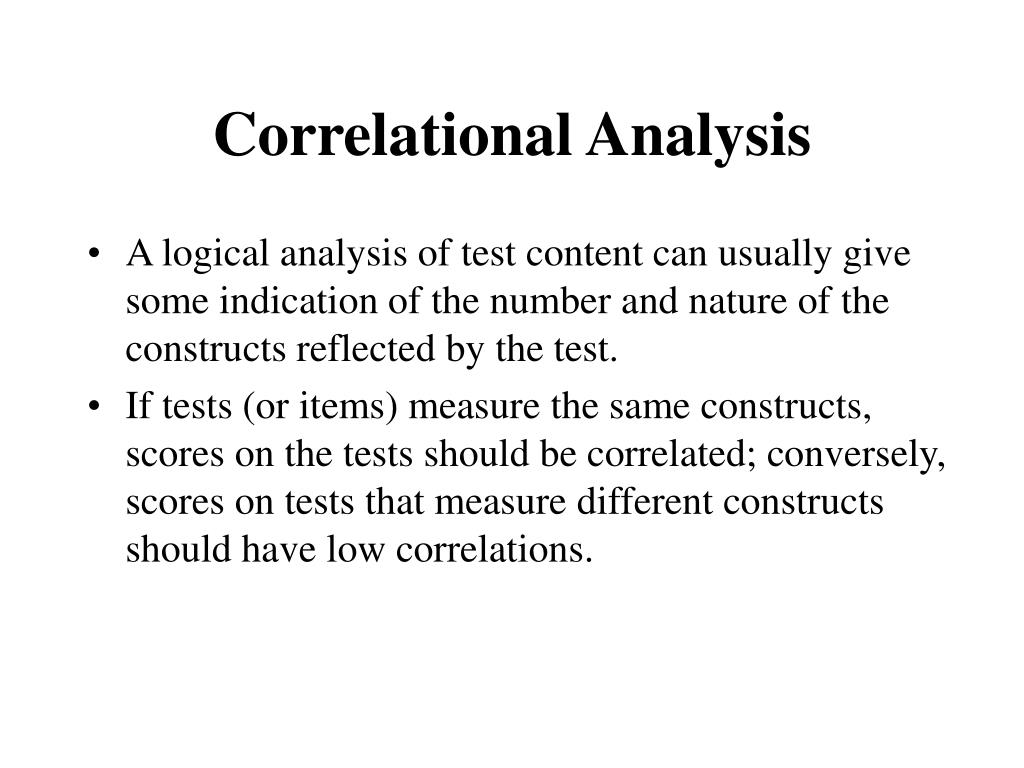 Correlational Analysis • A logical analysis of test content can usually give some indication of the number and nature of the constructs reflected by the test. • If tests (or items) measure the same constructs, scores on the tests should be correlated; conversely, scores on tests that measure different constructs should have low correlations.