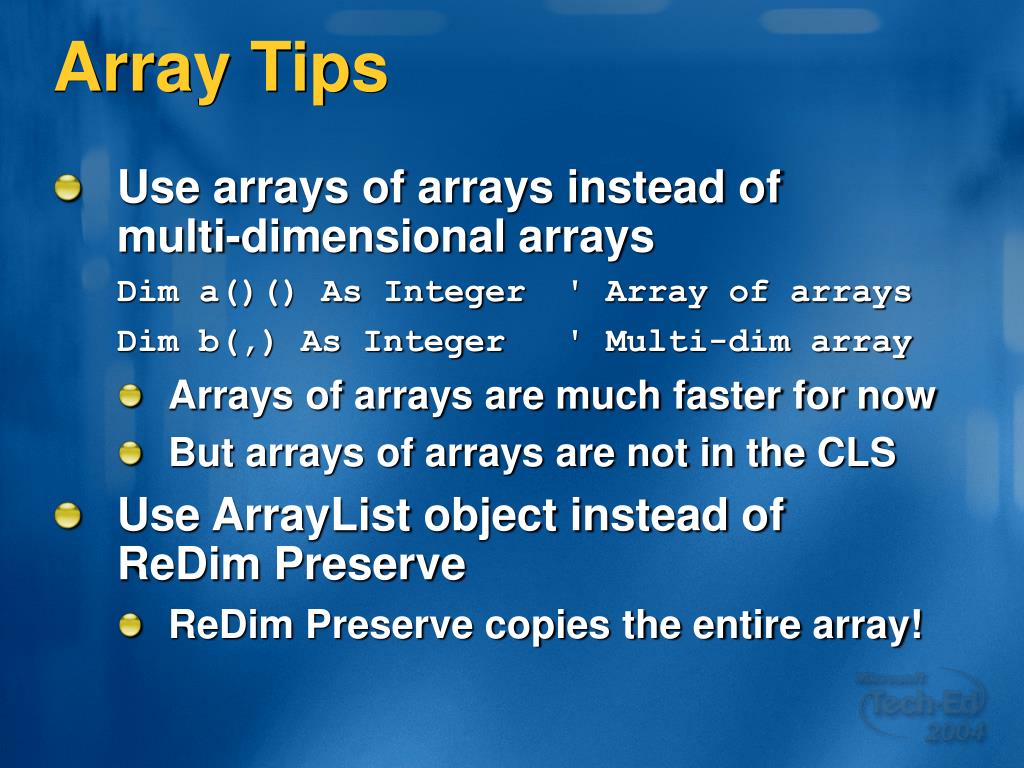 Array Tips • Use arrays of arrays instead of multi-dimensional arrays Dim a()() As Integer ' Array of arrays Dim b(,) As Integer ' Multi-dim array • Arrays of arrays are much faster for now • But arrays of arrays are not in the CLS • Use ArrayList object instead of ReDim Preserve • ReDim Preserve copies the entire array!