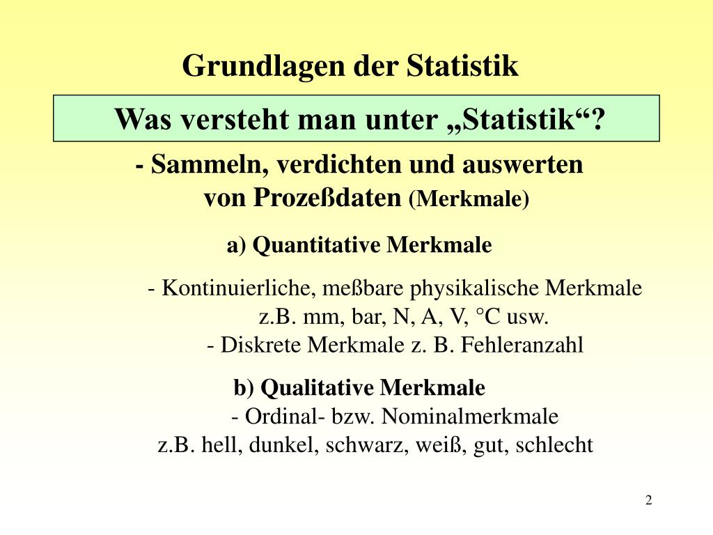 Grundlagen der Statistik Was versteht man unter „Statistik“? - Sammeln, verdichten und auswerten von Prozeßdaten (Merkmale)a) Quantitative Merkmale - Kontinuierliche, meßbare physikalische Merkmale z.B. mm, bar, N, A, V, °C usw. - Diskrete Merkmale z. B. Fehleranzahl b) Qualitative Merkmale - Ordinal- bzw. Nominalmerkmale z.B. hell, dunkel, schwarz, weiß, gut, schlecht