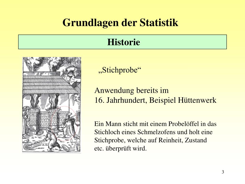 Grundlagen der Statistik Historie „Stichprobe“ Anwendung bereits im 16. Jahrhundert, Beispiel Hüttenwerk Ein Mann sticht mit einem Probelöffel in das Stichloch eines Schmelzofens und holt eine Stichprobe, welche auf Reinheit, Zustand etc. überprüft wird.