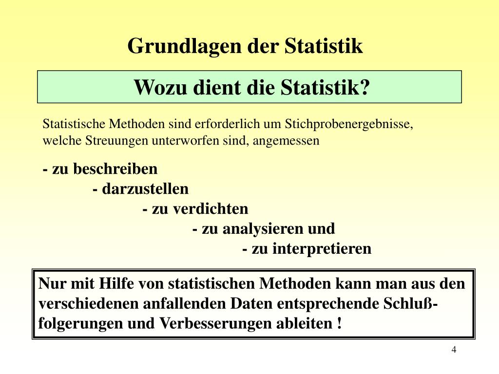 Grundlagen der Statistik Wozu dient die Statistik? Statistische Methoden sind erforderlich um Stichprobenergebnisse, welche Streuungen unterworfen sind, angemessen - zu beschreiben - darzustellen - zu verdichten - zu analysieren und - zu interpretieren Nur mit Hilfe von statistischen Methoden kann man aus den verschiedenen anfallenden Daten entsprechende Schluß-folgerungen und Verbesserungen ableiten !