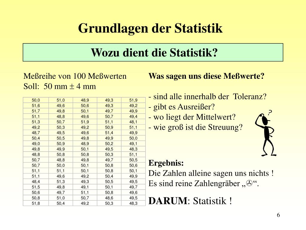 Grundlagen der Statistik Wozu dient die Statistik? Meßreihe von 100 MeßwertenSoll: 50 mm 4 mm Was sagen uns diese Meßwerte?- sind alle innerhalb der Toleranz?- gibt es Ausreißer?- wo liegt der Mittelwert?- wie groß ist die Streuung? Ergebnis:Die Zahlen alleine sagen uns nichts ! Es sind reine Zahlengräber „“. DARUM: Statistik !