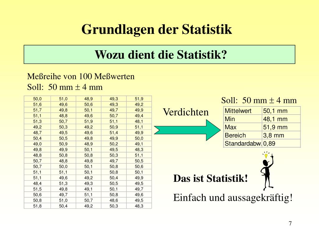 Grundlagen der Statistik Wozu dient die Statistik? Meßreihe von 100 MeßwertenSoll: 50 mm 4 mm Soll: 50 mm 4 mm Verdichten Das ist Statistik! Einfach und aussagekräftig!
