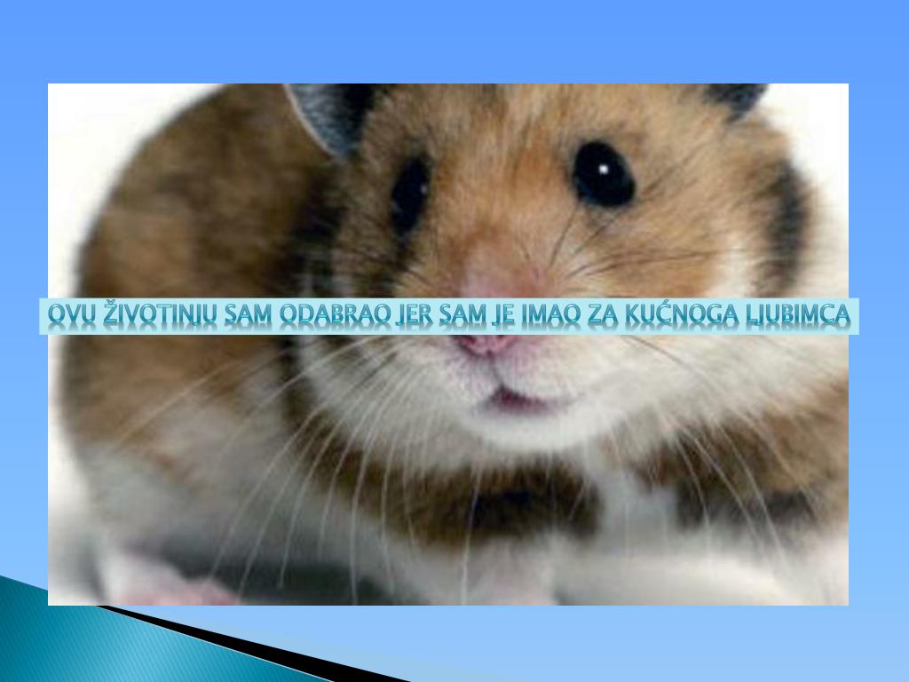 Moja najdraža ž ivotinja. Hrčak. Ovu životinju sam odabrao jer sam je imao za kućnoga ljubimca. Postoje puno vrste hrčaka kao što su:. Hrčak. To je kineska vrsta hrčka. Kineski hrčci su jako čiste životinje i mnogo vremena provode čisteći se i uređujući svoju dlaku. Sirijski hrčak.