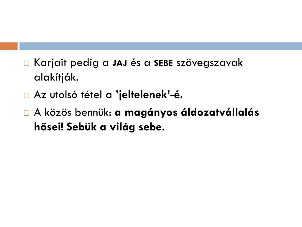 Karjait pedig a jajés a sebe szövegszavak alakítják. • Az utolsó tétel a ’jeltelenek’-é. • A közös bennük: a magányos áldozatvállalás hősei! Sebük a világ sebe.