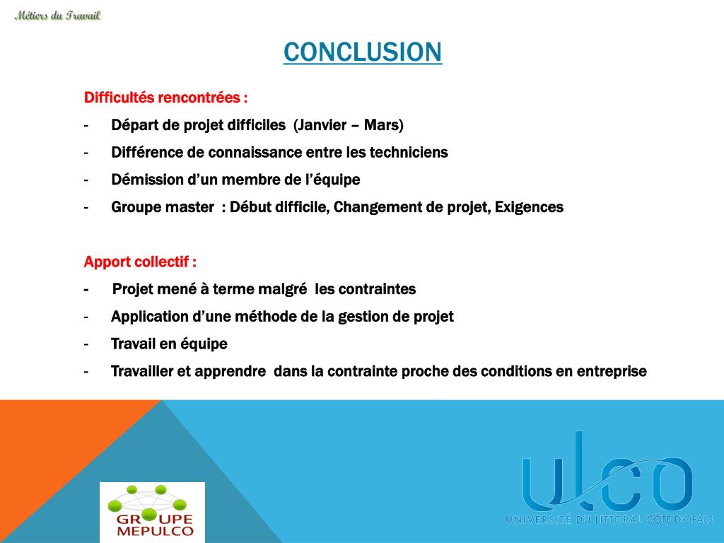 Conclusion • Difficultés rencontrées : • Départ de projet difficiles (Janvier – Mars) • Différence de connaissance entre les techniciens • Démission d’un membre de l’équipe • Groupe master : Début difficile, Changement de projet, Exigences • Apport collectif : • - Projet mené à terme malgré les contraintes • Application d’une méthode de la gestion de projet • Travail en équipe • Travailler et apprendre dans la contrainte proche des conditions en entreprise
