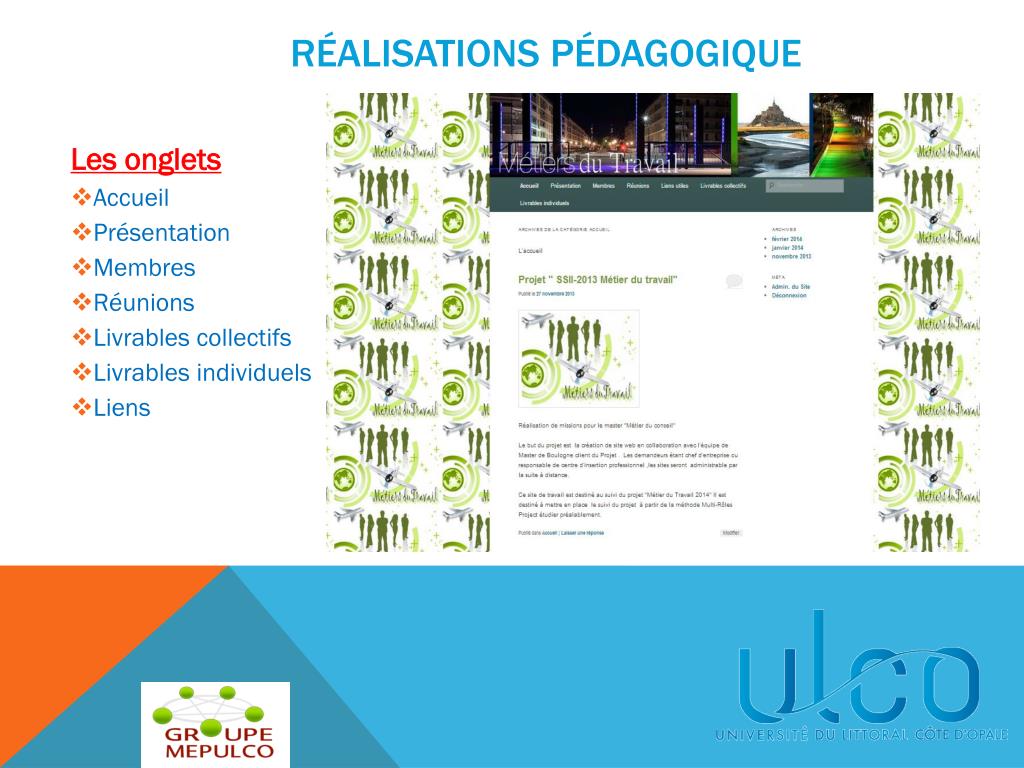 Réalisations pédagogique • Les onglets • Accueil • Présentation • Membres • Réunions • Livrables collectifs • Livrables individuels • Liens