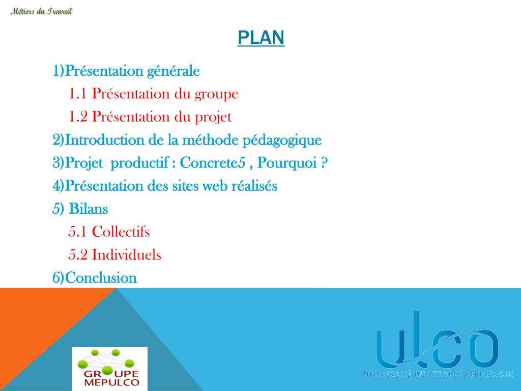 Plan • 1)Présentation générale • 1.1 Présentation du groupe • 1.2 Présentation du projet • 2)Introduction de la méthode pédagogique • 3)Projet productif : Concrete5 , Pourquoi ? • 4)Présentation des sites web réalisés • 5) Bilans • 5.1 Collectifs • 5.2 Individuels • 6)Conclusion