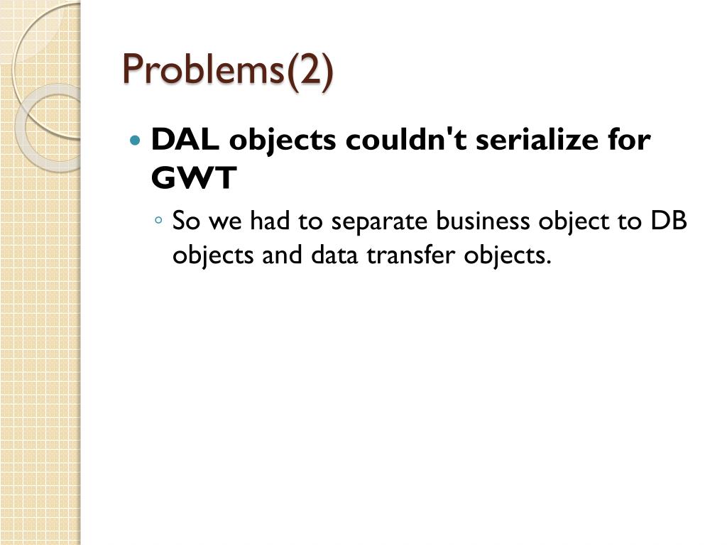 Problems(2) • DAL objects couldn't serialize for GWT • So we had to separate business object to DB objects and data transfer objects.