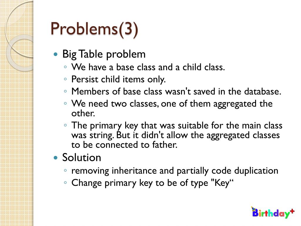 Problems(3) • Big Table problem • We have a base class and a child class. • Persist child items only. • Members of base class wasn't saved in the database. • We need two classes, one of them aggregated the other. • The primary key that was suitable for the main class was string. But it didn't allow the aggregated classes to be connected to father. • Solution • removing inheritance and partially code duplication • Change primary key to be of type "Key“