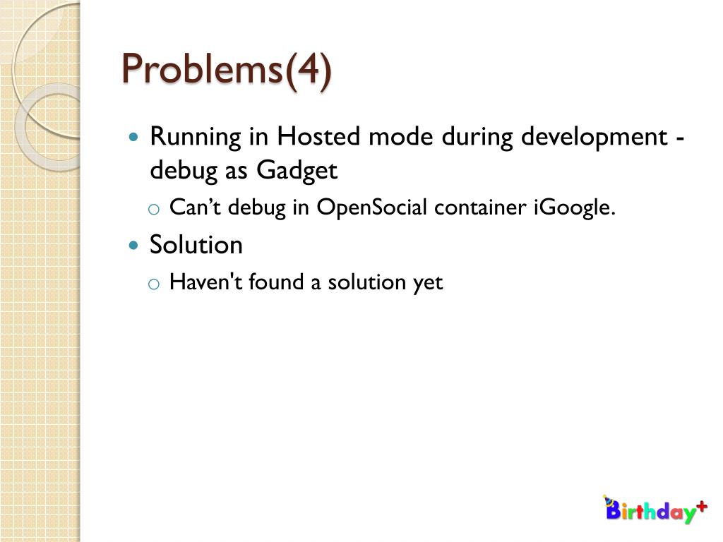 Problems(4) • Running in Hosted mode during development - debug as Gadget • Can’t debug in OpenSocial container iGoogle. • Solution • Haven't found a solution yet