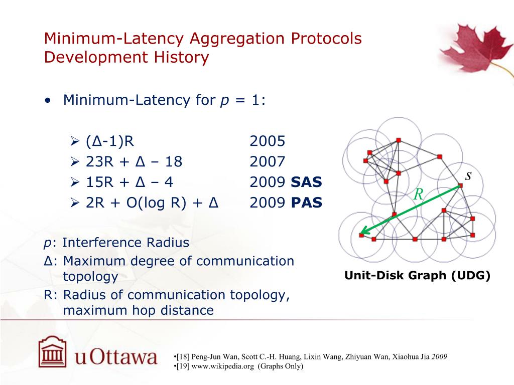 Minimum-Latency Aggregation Protocols Development History • Minimum-Latency for p = 1: • (Δ-1)R 2005 • 23R + Δ – 18 2007 • 15R + Δ – 4 2009 SAS • 2R + O(log R) + Δ 2009 PAS p: Interference Radius Δ: Maximum degree of communication topology R: Radius of communication topology, maximum hop distance s R Unit-Disk Graph (UDG) • [18] Peng-Jun Wan, Scott C.-H. Huang, Lixin Wang, Zhiyuan Wan, Xiaohua Jia 2009 • [19] www.wikipedia.org (Graphs Only)