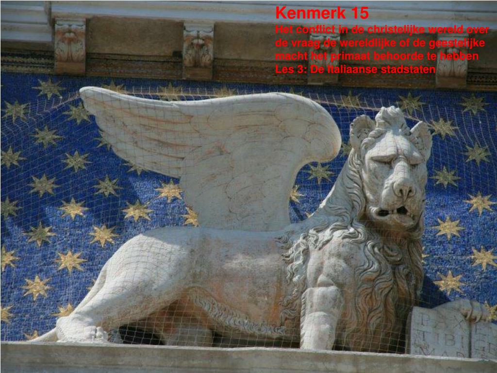 Kenmerk 15 Het conflict in de christelijke wereld over de vraag de wereldlijke of de geestelijke macht het primaat behoorde te hebben Les 3: De Italiaanse stadstaten. H3: § 9:p54. De opkomst van de Italiaanse stadstaten.