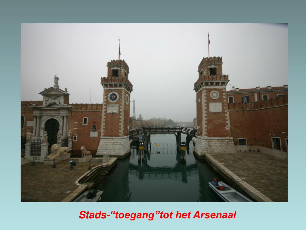 Economische Kracht • Door haar ligging • aan/in zee was scheepvaart normaal • vormde ze een kruispunt tussen het Oosten en Westen • Zij was (net als Genua) een goed vertrekpunt voor de kruistochten, hetgeen handel betekende (1095 e.v.). • Door haar banden met Byzantium kon men makkelijk aan allerlei goederen uit het Oostenkomen. • Marco Polo was bijvoorbeeld een van haar inwoners • Haar welvaart leidde tot afgunst en rivaliteit • Om dit de baas te kunnen zijn, bouwden de Venetianen het grootste industriële complex van de middeneeuwen (1104) • Het Arsenaal; een scheepswerf die in tijd van politieke crisis meer dan 50 boten meer maand kon bouwen • Men bouwde zowel handels- als oorlogsschepen • Op haar hoogtepunt was het 46 hectaren groot en werkten er 16.000 mensen • Zo kon men bij de Kruistochten en zeeoorlogen de grootste vloot te water laten gaan