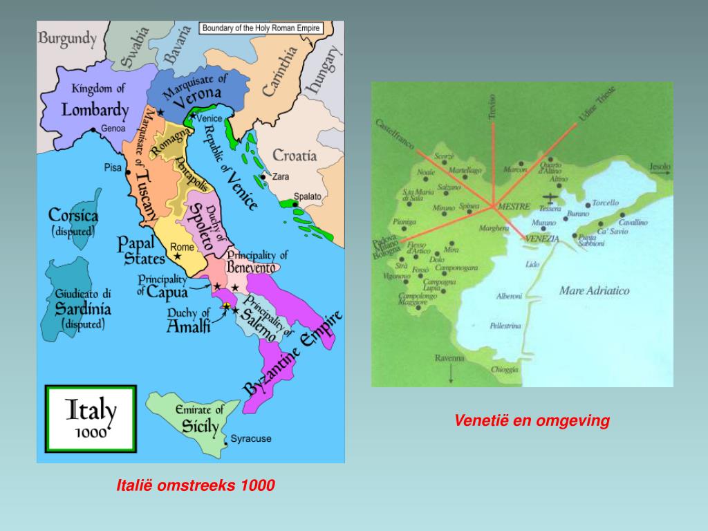 H3:§ 9:p54 De opkomst van de Italiaanse stadstaten • Genua, Pisa, Venetië en Amalfi waren de stadstaten (lees: republieken) die in de middeleeuwen (vanaf 10e eeuw) • Tot grote economische bloei kwamen • Enorm veel gebied in Italië en het Middellands-Zeegebiedveroverden • Elkaars vijanden/concurrenten waren • In het hb staat op p. 54 een fout: Kooplieden uit Genua en Venetië werkten veelal niet samen, meestal juist het tegenovergestelde. • Venetië als voorbeeld in deze presentatie • Waarom? • Belangrijkste stadstaat