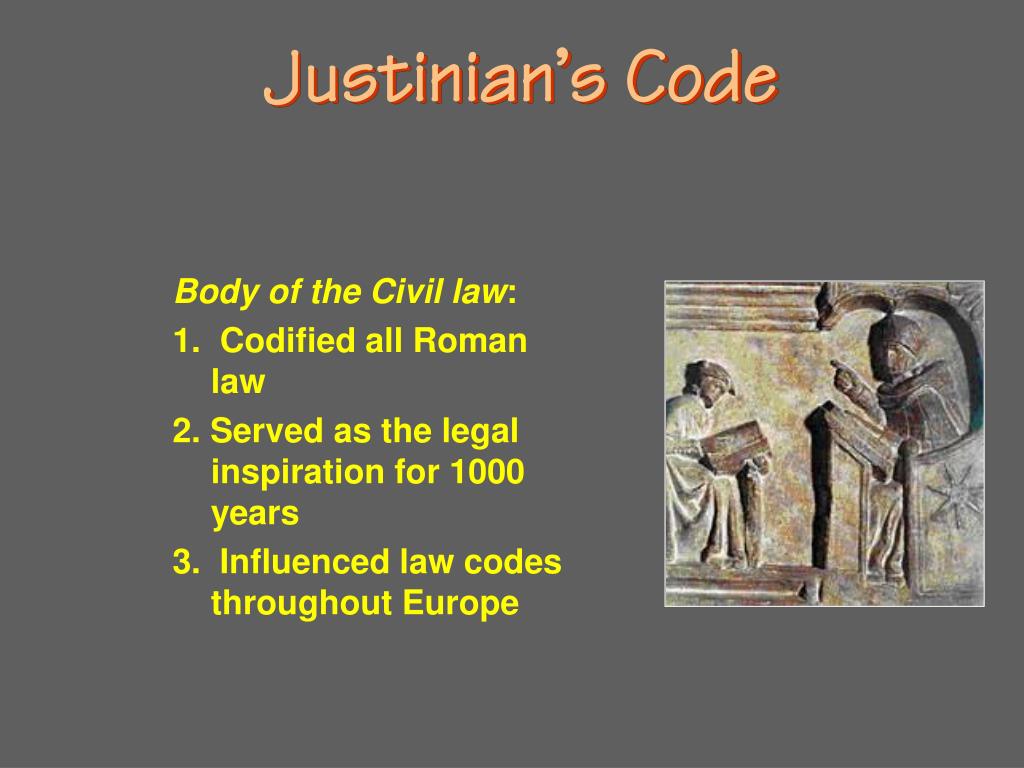 Justinian’s Code Body of the Civil law: 1. Codified all Roman law 2. Served as the legal inspiration for 1000 years 3. Influenced law codes throughout Europe