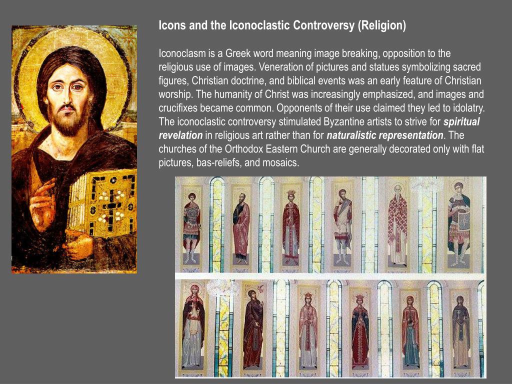 Icons and the Iconoclastic Controversy (Religion) Iconoclasm is a Greek word meaning image breaking, opposition to the religious use of images. Veneration of pictures and statues symbolizing sacred figures, Christian doctrine, and biblical events was an early feature of Christian worship. The humanity of Christ was increasingly emphasized, and images and crucifixes became common. Opponents of their use claimed they led to idolatry. The iconoclastic controversy stimulated Byzantine artists to strive for spiritual revelation in religious art rather than for naturalistic representation. The churches of the Orthodox Eastern Church are generally decorated only with flat pictures, bas-reliefs, and mosaics.
