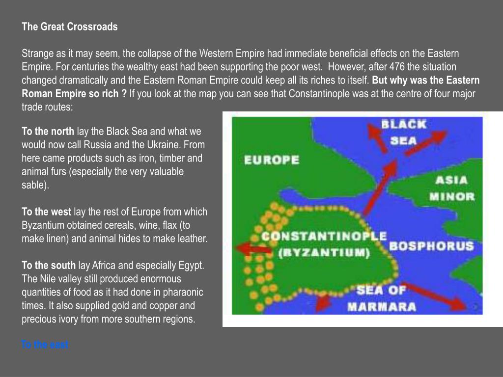 The Great Crossroads Strange as it may seem, the collapse of the Western Empire had immediate beneficial effects on the Eastern Empire. For centuries the wealthy east had been supporting the poor west. However, after 476 the situation changed dramatically and the Eastern Roman Empire could keep all its riches to itself. But why was the Eastern Roman Empire so rich ? If you look at the map you can see that Constantinople was at the centre of four major trade routes: To the north lay the Black Sea and what we would now call Russia and the Ukraine. From here came products such as iron, timber and animal furs (especially the very valuable sable). To the west lay the rest of Europe from which Byzantium obtained cereals, wine, flax (to make linen) and animal hides to make leather. To the south lay Africa and especially Egypt. The Nile valley still produced enormous quantities of food as it had done in pharaonic times. It also supplied gold and copper and precious ivory from more southern regions. To the east lay the most important trade route of all. From Arabia came valuable perfumes, from Persia expensive carpets, from India spices and precious stones (especially rubies and emeralds) and from China came silk.