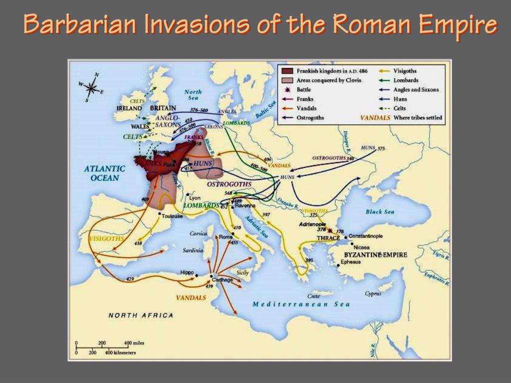What factors caused the Western Roman Empire to collapse in 476 ce? • Disease ( 2nd century ce went from 60 – 45 million) or reduced by 25% • Internal struggles235 ce- 284ce 26 people claimed the throne • Barbarian invasions ( Huns pressured Visigoths, Ostrogoths, Vandals into Roman lands • Sheer size of the empire